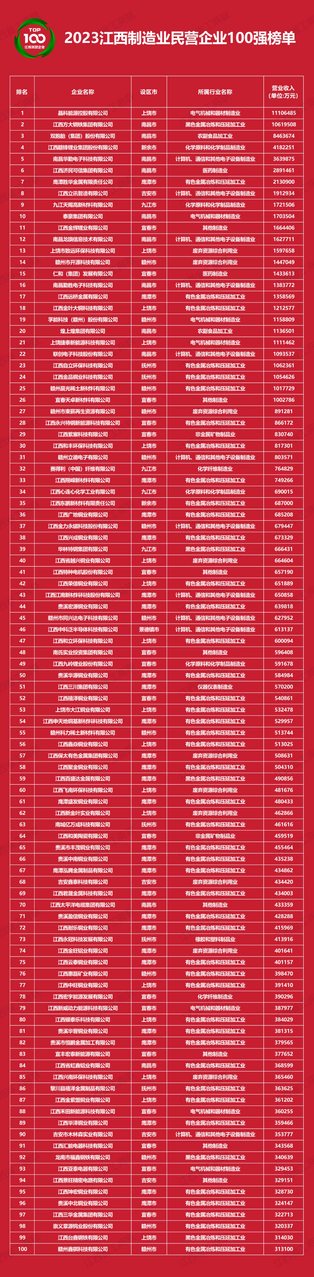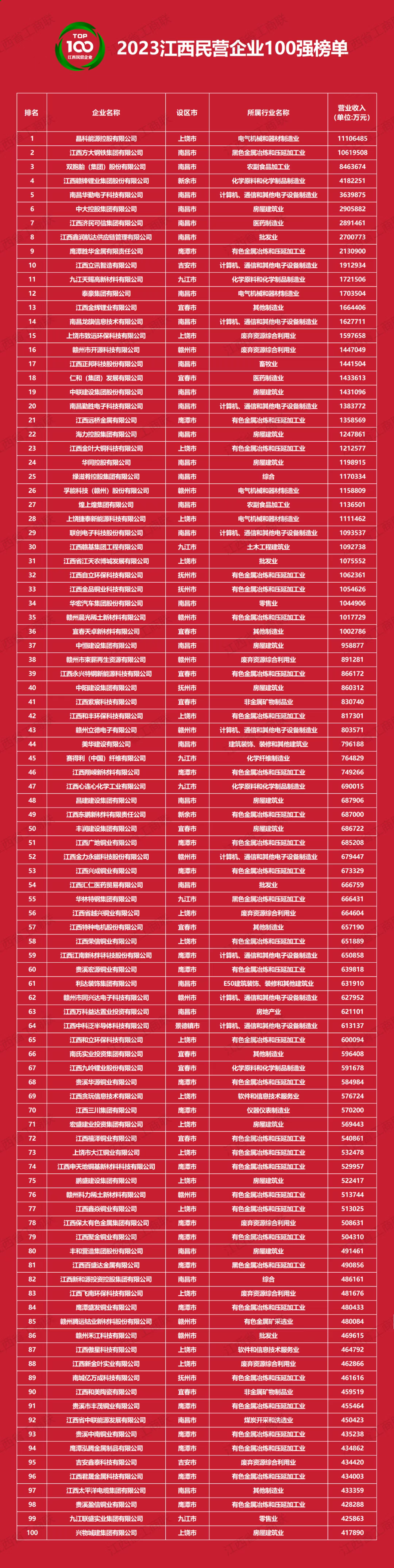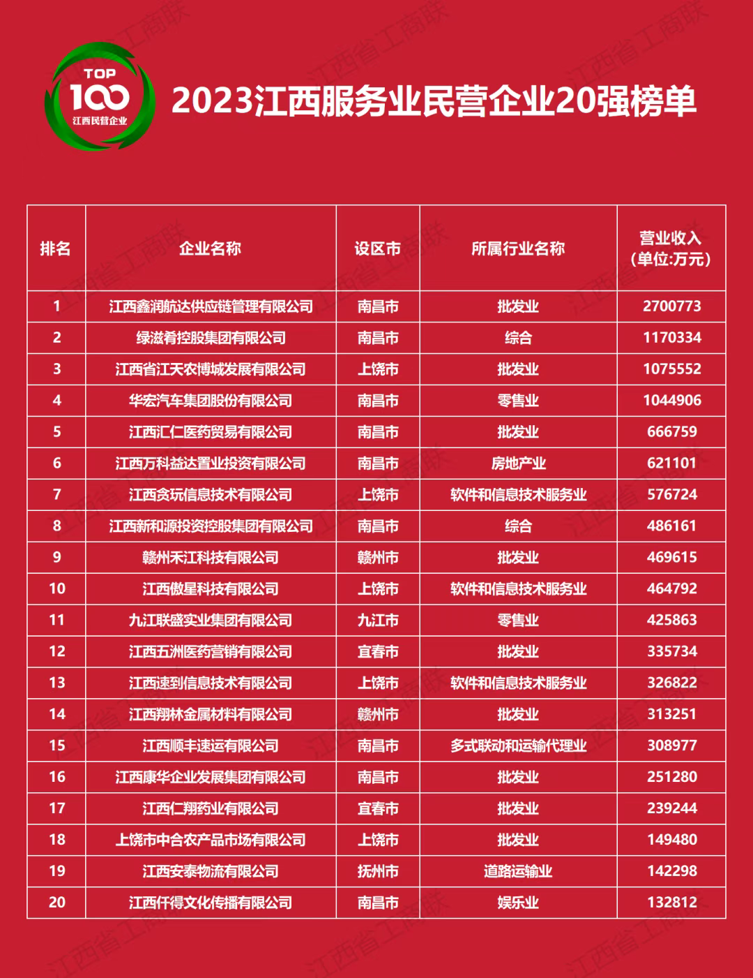 近日在2023江西民营企业100强和社会责任发布会上,2023江西民营企业100强、制造业民营企业100强、服务业民营企业20强榜单震撼发布。