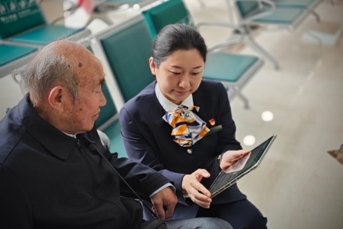 图:客服大厅内工作人员使用Pad为老年客户办理业务