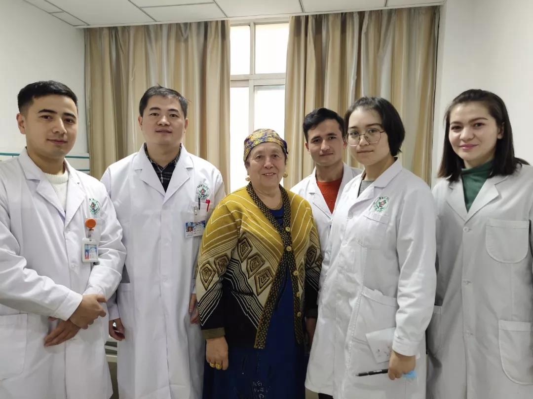 欧肉孜古丽(左三)感谢吴庭胜医生(左二)治好了她的肩痛